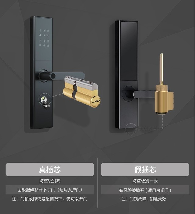 相比于传统的机械锁,智能锁多出了个“真假插芯”的争论点:部分智能锁会在应急开锁装置上将锁芯贯穿于锁体,接近执手机械锁的结构,也就是“真插芯”;而另外一部分智能锁则将机械锁芯外置到面板上,用方钢或铁片代替锁芯拨片的工作方式则为“假插芯”。
