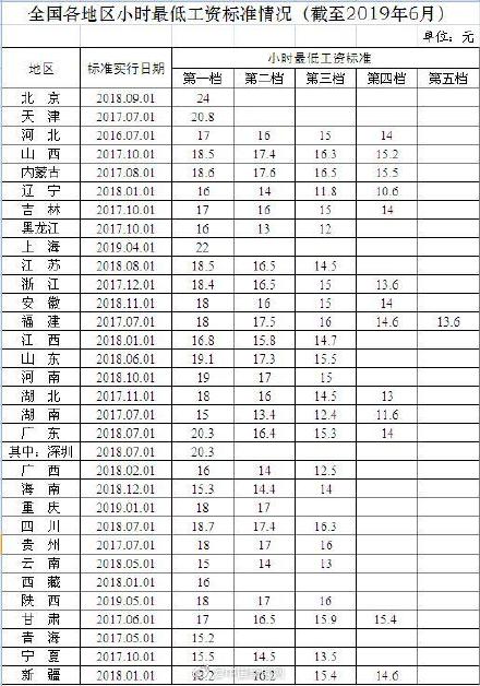 近日,国家人力资源和社会保障更新了全国31个省、直辖市和自治区以及广东省深圳市,共32个统计单位,截至2019年6月的月最低工资标准情况和小时最低工资标准情况。