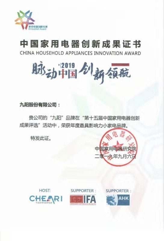 9月6日,由中国家用电器研究院主办的“第十五届中国家用电器创新成果推介”活动在德国柏林IFA展如期举行。此次活动中,九阳股份有限公司连续十一年荣获“年度最具影响力小家电品牌”殊荣。