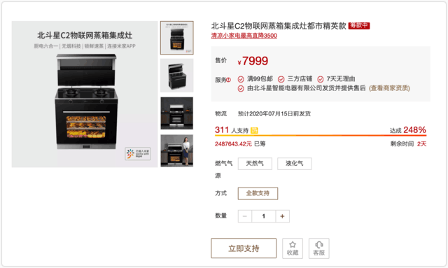 之所以完成了如此高的目标,是因为北斗星C2物联网蒸箱集成灶,开辟了厨电物联网进程的新赛道。它能够接入家庭网络,利用手机进行远程遥控以及和一些传感器搭配联动,同时具备厨电六合一的功能,以及无烟科技、锁鲜速蒸功能等等。再加上7999元的众筹好价,吸引了一大批消费者的支持。