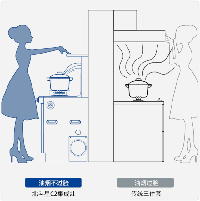 北斗星C2物联网蒸箱集成灶绝对是开放式厨房的首选,16cm-22cm黄金吸烟区,1140m3/h巨大风量,油烟不过脸,爆炒辣椒都不怕,开放式厨房的首选产品。